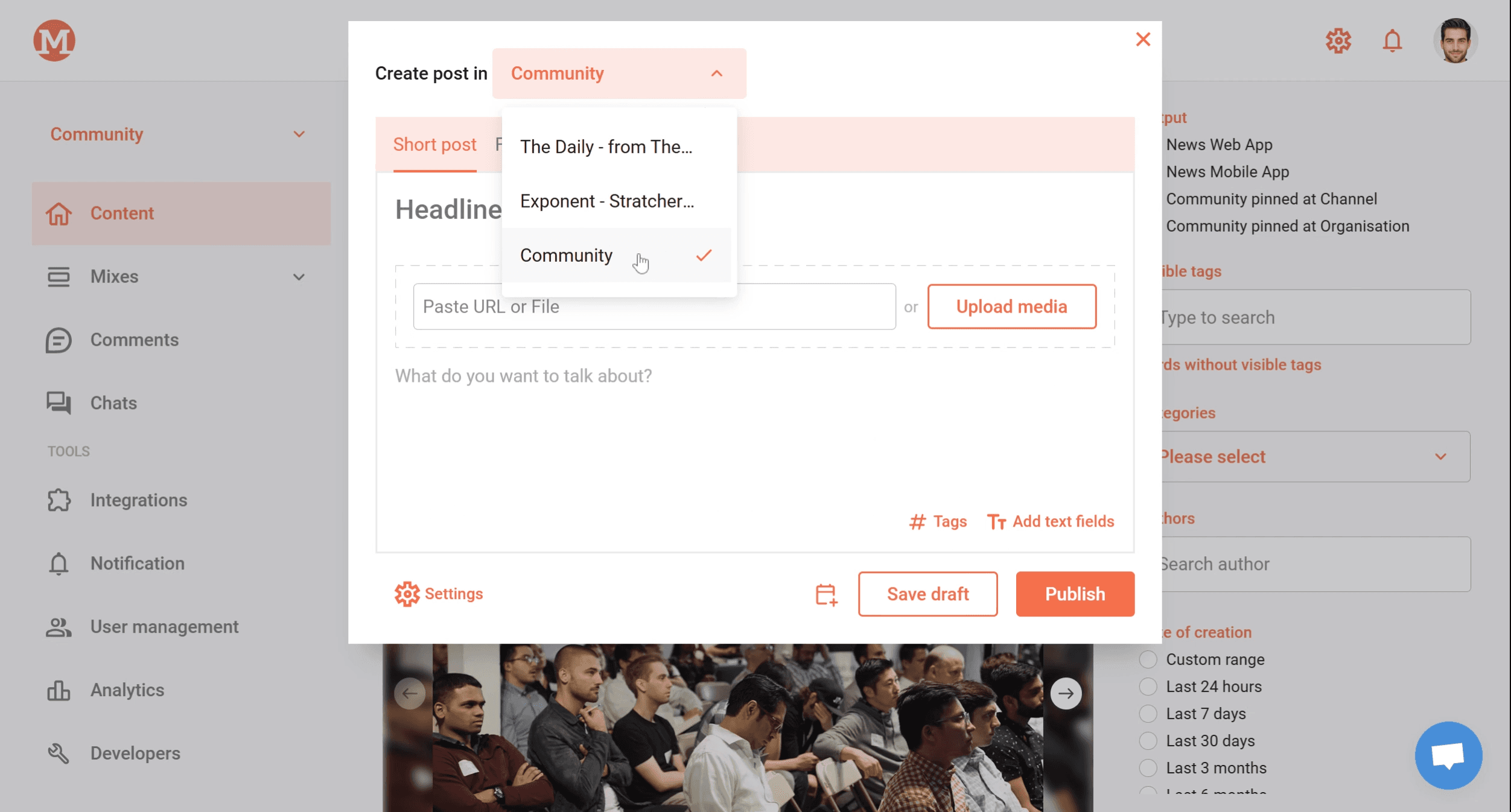 Step 4: Enter a strong headline for your post and add a file such as one or more images, a video, or an audio file by either uploading a file or pasting a URL.